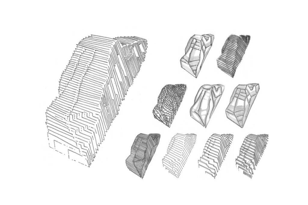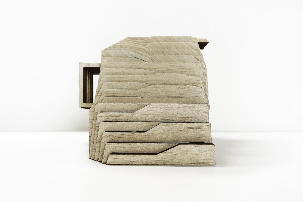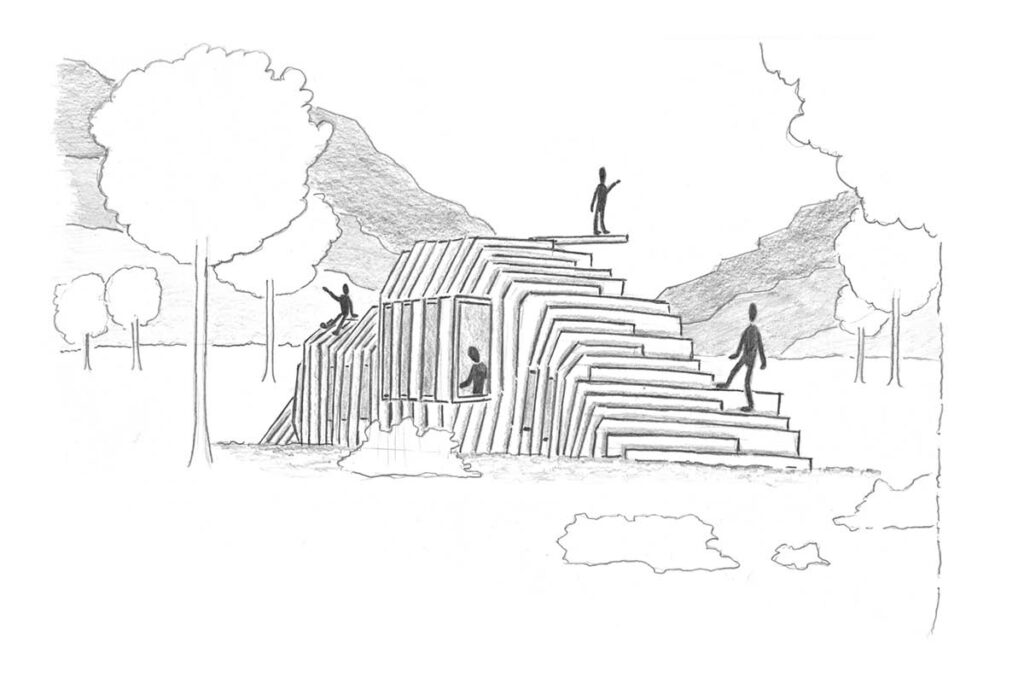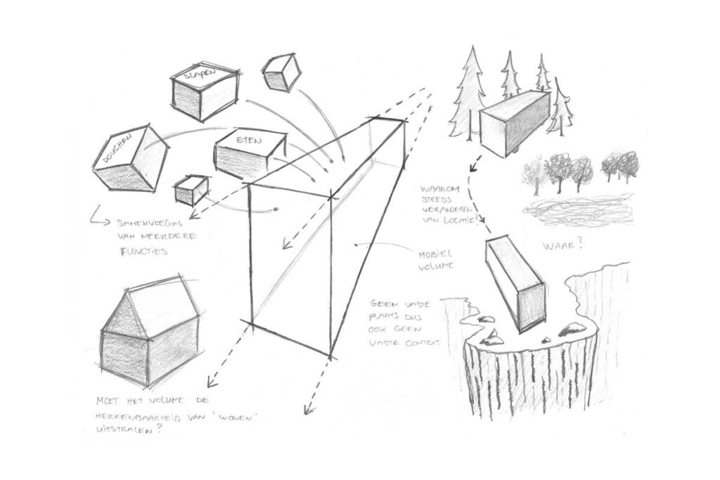 De rots kenmerkt zich als een vloeiende, robuuste vorm, in een veranderlijke omgeving. Het is niet enkel een statische drager voor diverse leeffuncties, maar een actieve versterker van de dialoog tussen object en omgeving. Deze mobiele woon-unit is voorzien van de basis voorzieningen voor op locatie te verblijven. Functies als slapen en eten worden comfortabel gevangen onder een houten schil. De totaalcompositie biedt een beloopbaar volume. Zelfs in een landschap zonder dynamiek, kan men van een actieve perceptie van de omgeving genieten. De rots is een landschap in een landschap. Een mobiel uitzichtpunt.