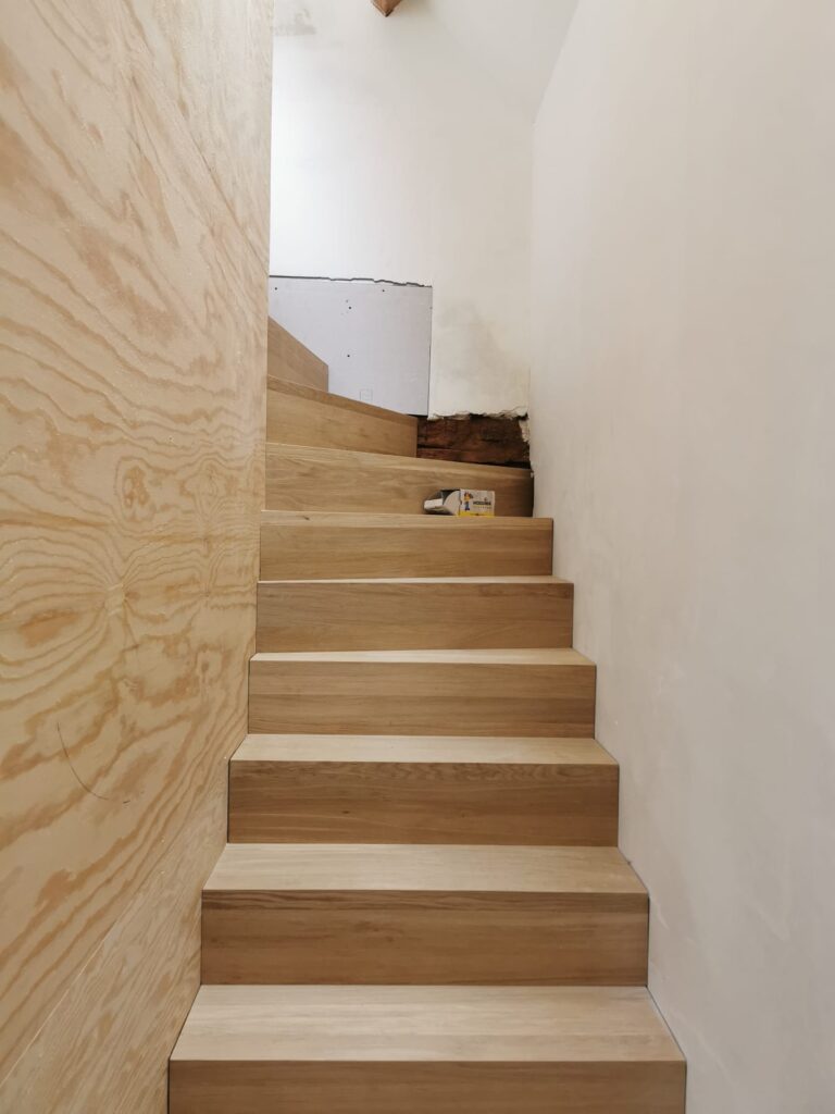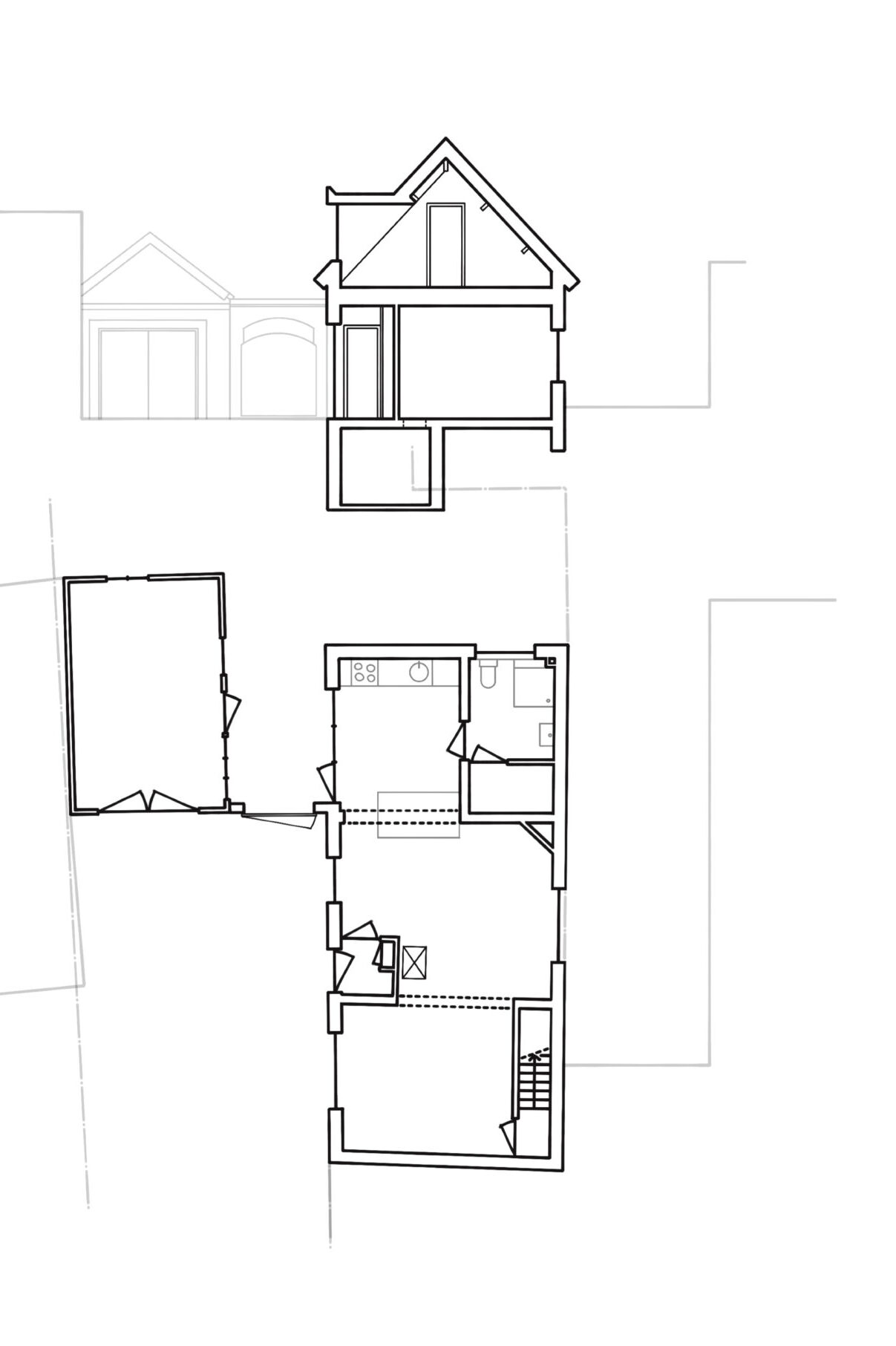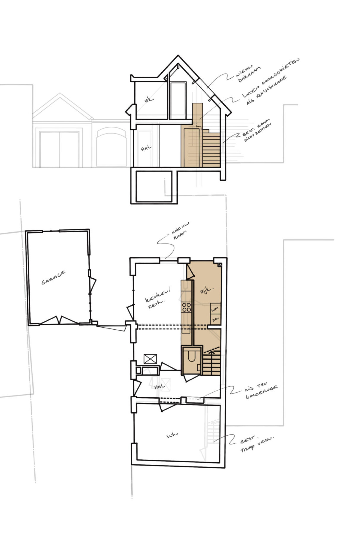 Gelegen aan een drukke doorgaande weg kent deze karakteristieke jaren ’30 woning toch enige geborgenheid in de oksel van de naburige bebouwing. Het woonhuis beschikt momenteel over een minimale dialoog tussen de woonruimtes en de riante oprit en achtertuin. Daarnaast bevindt de huidige badkamer zich naast de keuken en dienen twee van de drie slaapkamers op de verdieping als doorloop. Een grootschalige renovatie biedt de mogelijkheid voor een optimalere indeling en verduurzaming van het pand. De dienende functies zoals het toilet, berging en de keuken vouwen zich rondom de nieuwe trap die in het midden van de woning geplaatst wordt. Daardoor is het mogelijk het contact tussen de keuken en achtertuin te vergroten, en voor te sorteren op een toekomstige uitbreiding aan de oostzijde.